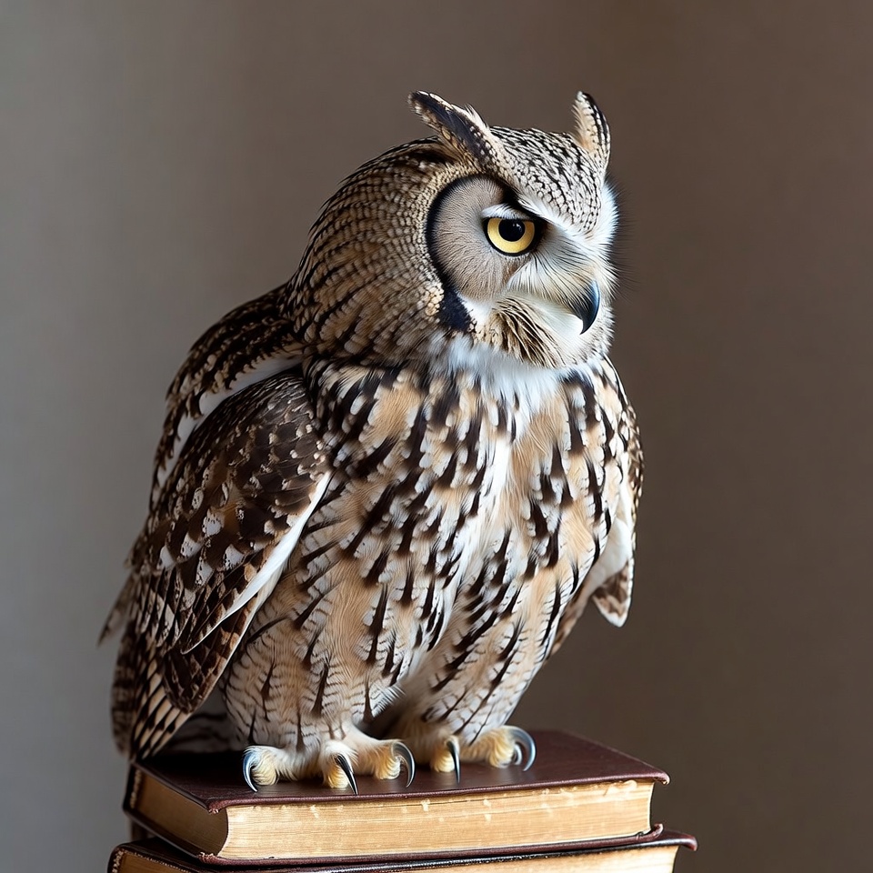 A great horned owl with large yellow eyes and prominent ear tufts perches on a stack of old leather-bound books. Its feathers are a mix of brown, white, and gray with intricate patterns. The owl faces forward with a serious expression against a plain background.