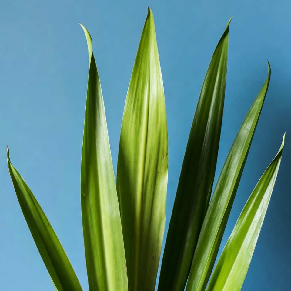 Several vibrant green leaves with pointed tips fan out against a solid blue background. The leaves have smooth edges and prominent veins, creating a striking contrast. The plant appears fresh and isolated for display.