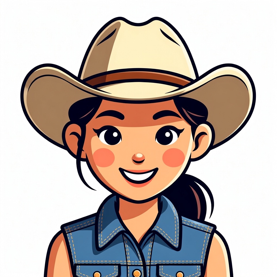 Asian, Asian girl, beige hat, big eyes, cartoon, clipart, cowgirl, cute face, denim vest, female, happy expression, illustration, isolated background, ponytail, rosy cheeks, sleeveless vest, smiling girl, vector art, young girl, cowboy hat