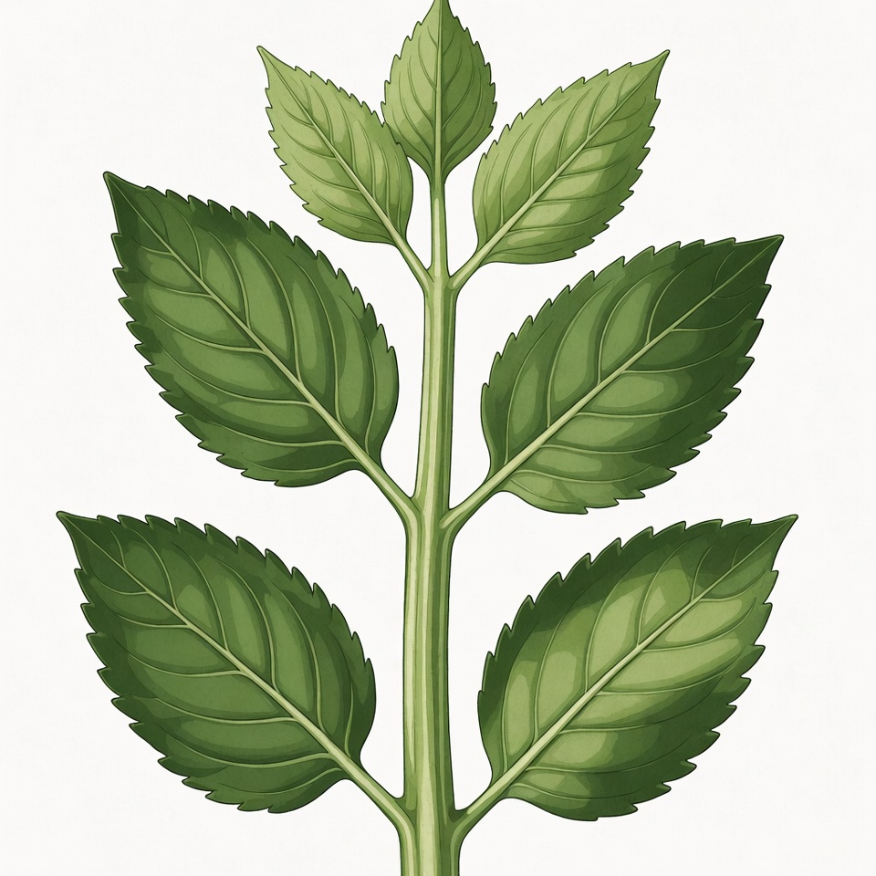 A detailed vector illustration of a basil plant with multiple serrated green leaves growing from a central stem. The leaves are vibrant green and arranged symmetrically around the upright stalk. It is depicted on a white isolated background.