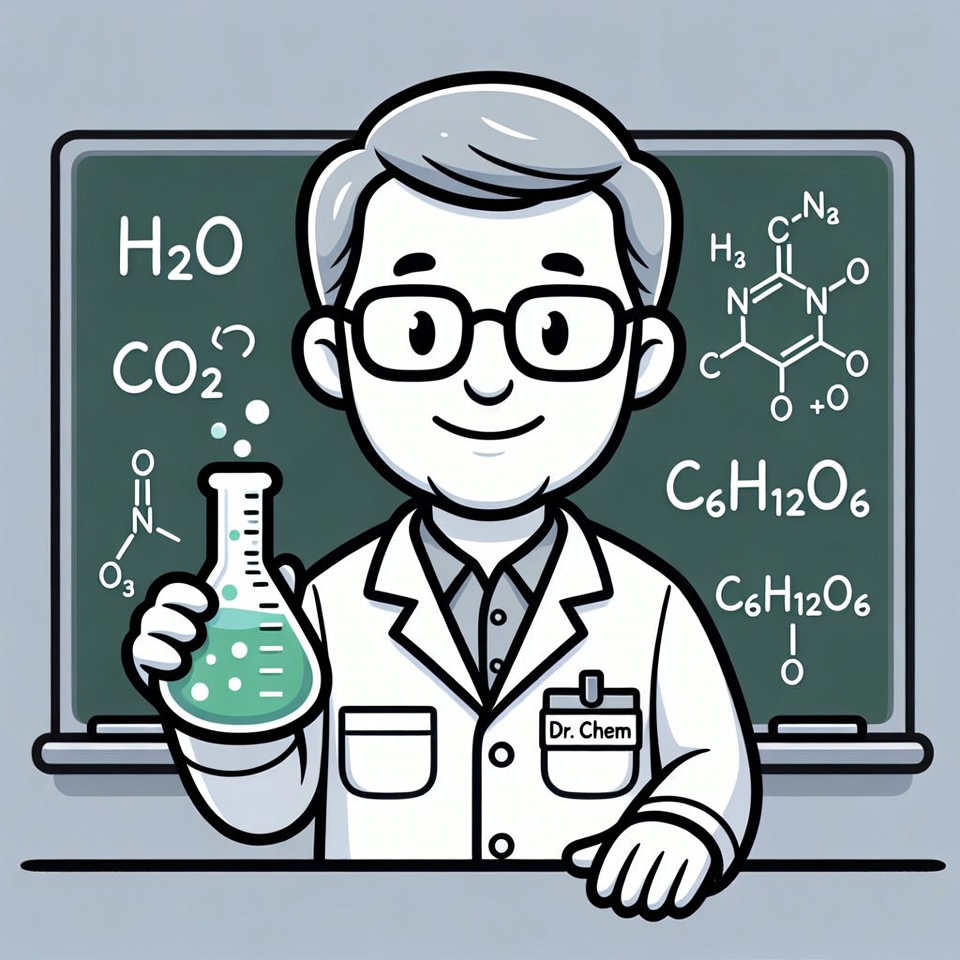 A cartoon illustration depicts a smiling male chemist with glasses and white hair standing in front of a chalkboard covered in chemical formulas like H2O, CO2, and glucose. He wears a white lab coat with a 'Dr. Chem' name tag and holds a green test tube with liquid. The style is simple line art with flat colors on an isolated background.
