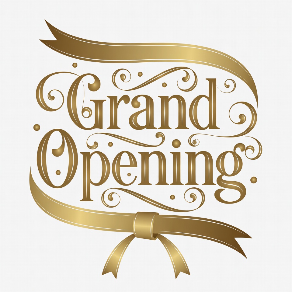 banner, business launch, clipart, elegant font, event signage, gold ribbon, golden design, illustration, isolated background, ornate text, promotional graphic, ribbon bow, store opening, swirls, vector art, grand opening