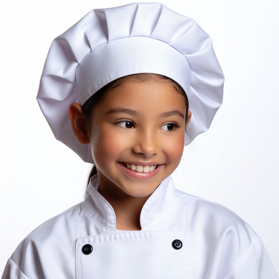 A young girl with smiling expression wears a tall white chef's hat and matching chef's jacket with buttons. She faces the camera directly on a plain white background. Her dark hair is tied back in a ponytail.