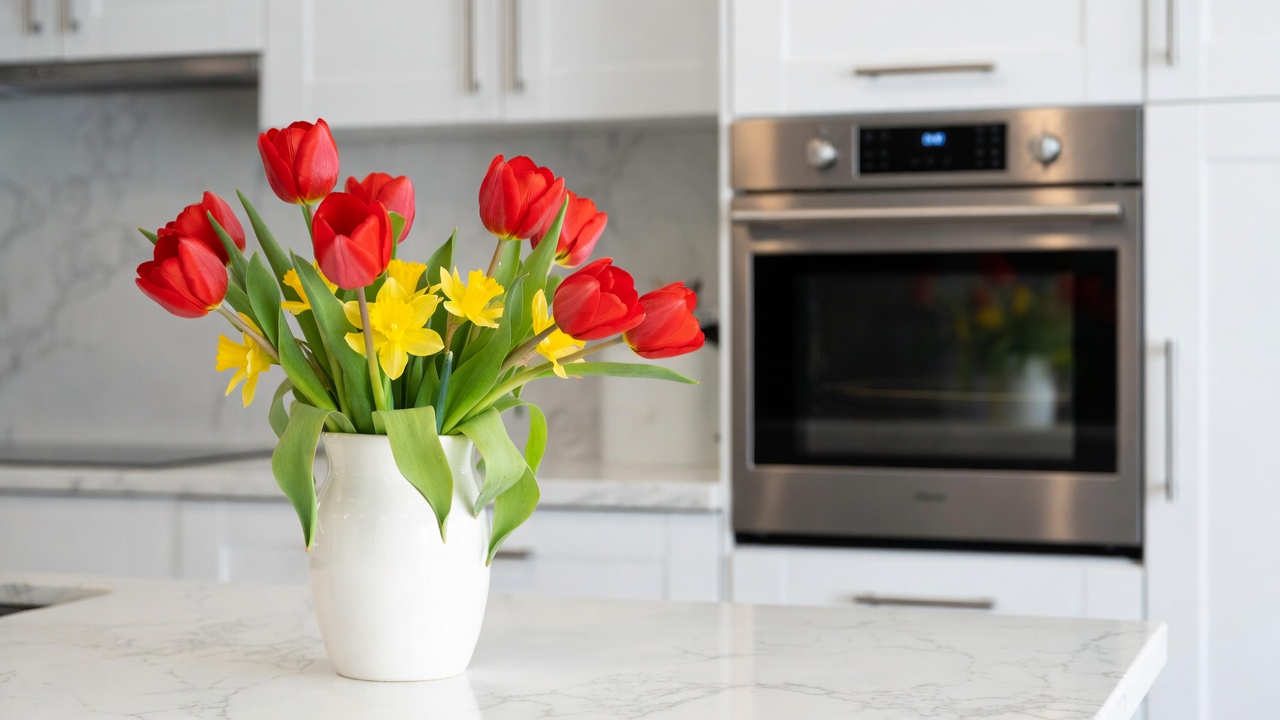 bouquet, floral decor, flower arrangement, flowers, fresh flowers, kitchen counter, kitchen decor, marble countertop, modern kitchen, red tulips, stainless steel oven, white cabinets, white vase, yellow tulips, tulips