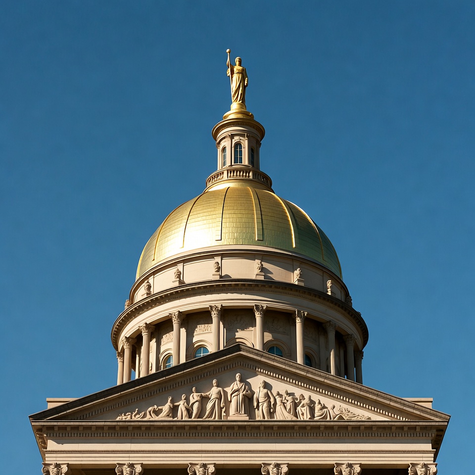 A grand capitol building features a large golden dome topped with a golden Statue of Liberty figure holding a torch. The neoclassical architecture includes Corinthian columns and a pediment with carved figures. The structure stands against a clear blue sky.