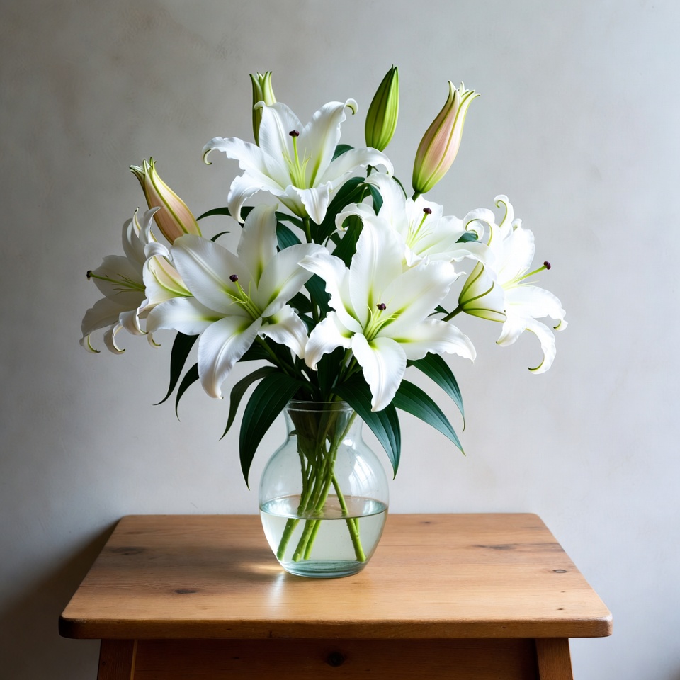 A bouquet of white lilies with some peach buds stands in a clear glass vase on a wooden table. The lilies feature large white petals and long green stems with leaves. The background is a plain light wall.