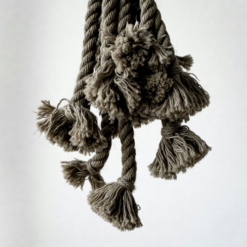 Several thick, braided ropes in a tan color hang downward against a white background. The ends of the ropes are frayed and form bushy tassels. The ropes are bundled together at the top.