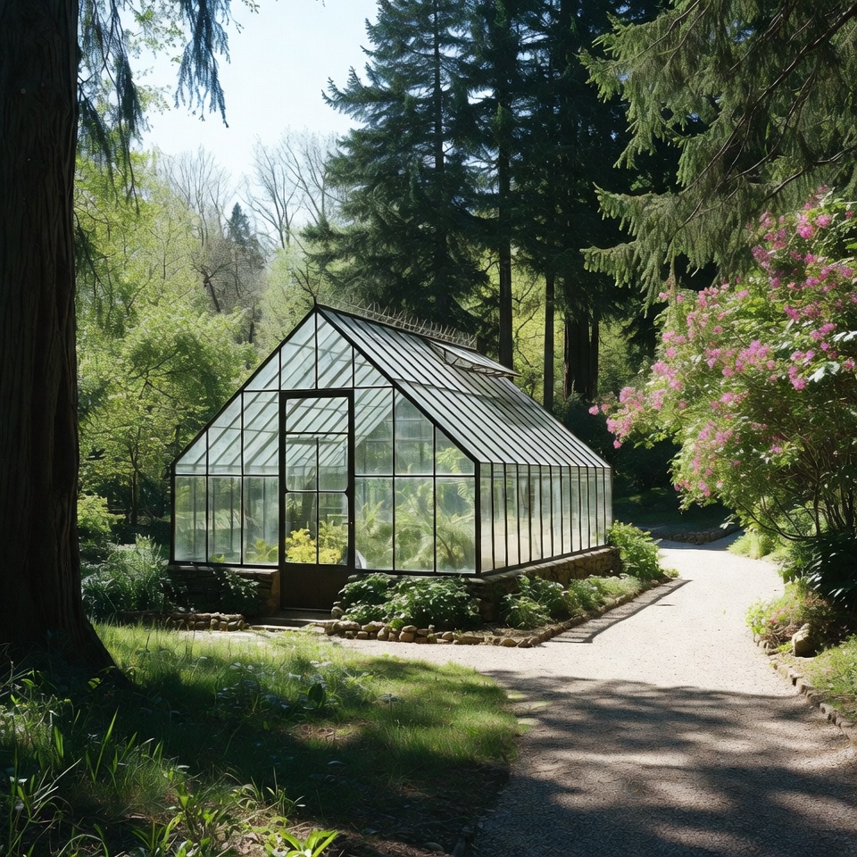 A Victorian-style glass greenhouse stands amidst tall evergreen trees and lush greenery. Surrounded by flowering shrubs, rocks, and a gravel path, sunlight filters through the transparent panes illuminating plants inside. The structure features a pitched roof and wooden base in a serene woodland setting.