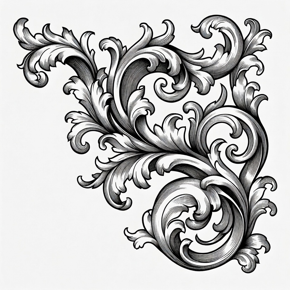 artistic doodle, baroque design, black ink, clipart, corner ornament, decorative border, elegant curl, filigree art, foliage pattern, graphic element, illustration, ink illustration, isolated design, line art, ornate pattern, scrollwork, swirling leaves, tattoo design, victorian style, vine motif, vintage ornament, white background, floral design