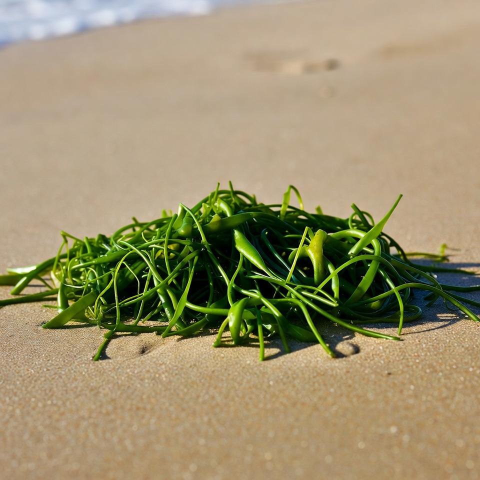 A pile of fresh green seaweed lies on the sandy beach near ocean waves. The seaweed has long, thin strands with small buds, casting a shadow on the golden sand. Footprints are visible nearby in the sand.