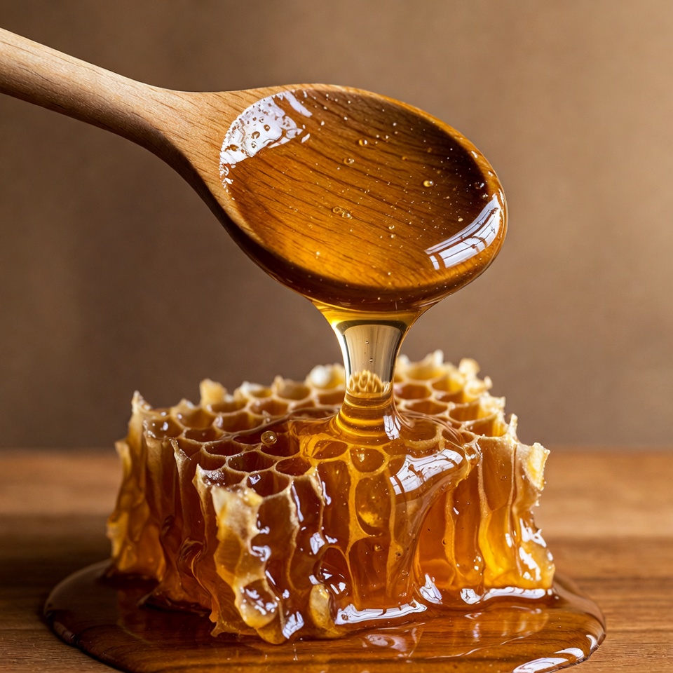 A wooden spoon holds dripping golden honey over a piece of honeycomb on a wooden surface. The honey forms viscous strands connecting the spoon to the textured honeycomb. A warm brown background highlights the rich amber color and glossy texture of the honey.