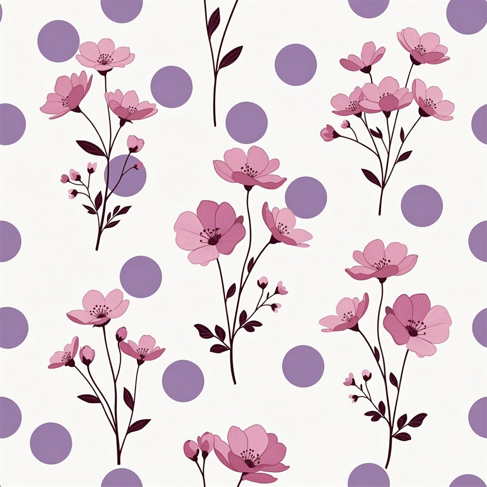 A seamless illustration features clusters of delicate pink flowers with thin green stems scattered across a white background dotted with purple polka dots. The flowers have multiple petals and small buds, arranged in a repeating pattern. The design is simple and vector-style with clean lines.