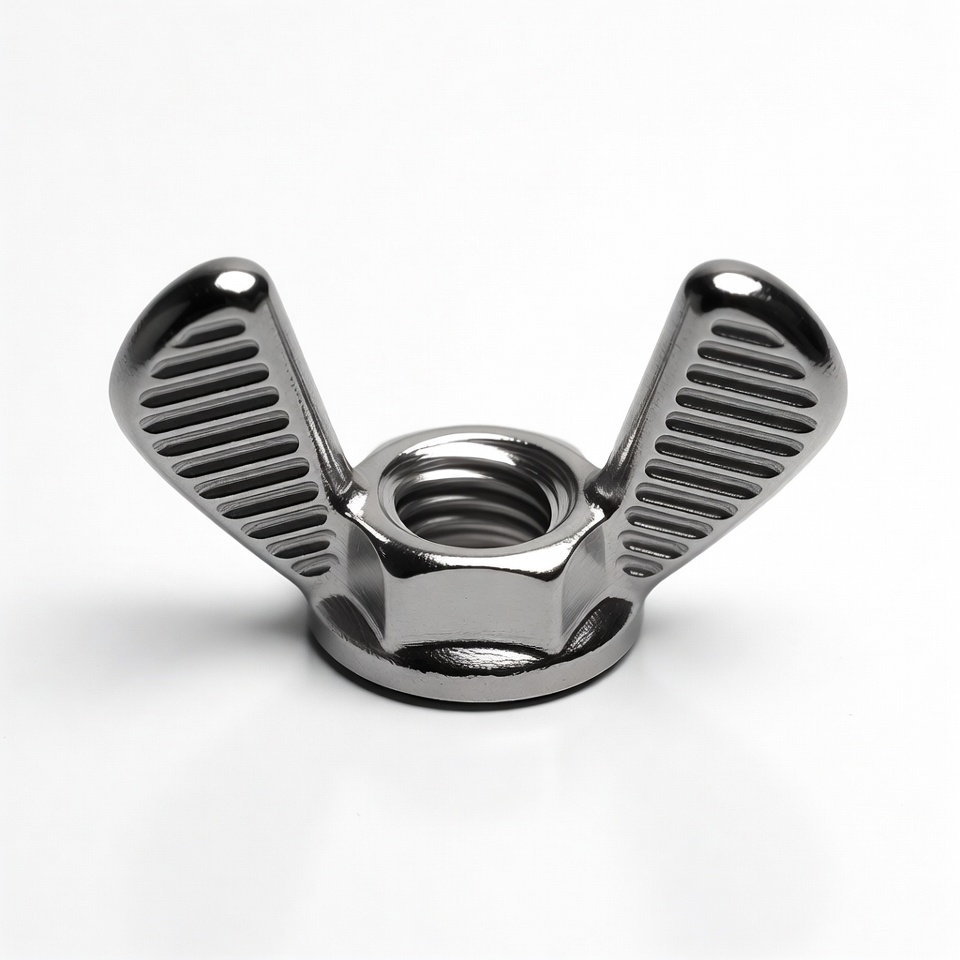 DIY, bolt nut, chrome, closeup, component, engineering, fastener, hardware, industrial, isolated, isolated background, machinery, mechanical, metal, nut, part, shiny, silver, stainless steel, threaded, tool, white background, wingnut, wing nut