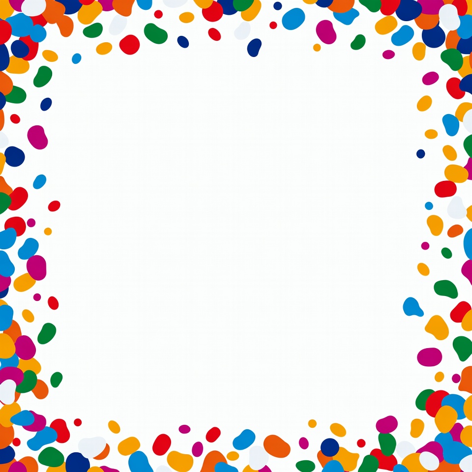 A vibrant border of multicolored confetti dots surrounds a large white empty space. The confetti features various shades of red, blue, yellow, green, orange, and purple. The design is simple and isolated on a white background.