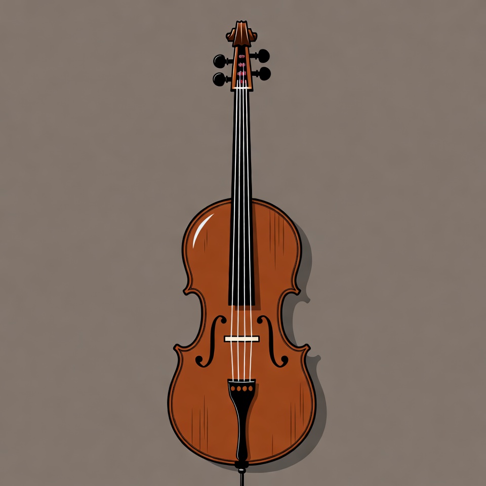 A detailed line drawing illustration of a wooden cello stands upright against a plain gray background. The cello features a glossy brown body with f-holes, scroll, bridge, and tailpiece. Subtle shadows give it a three-dimensional appearance.