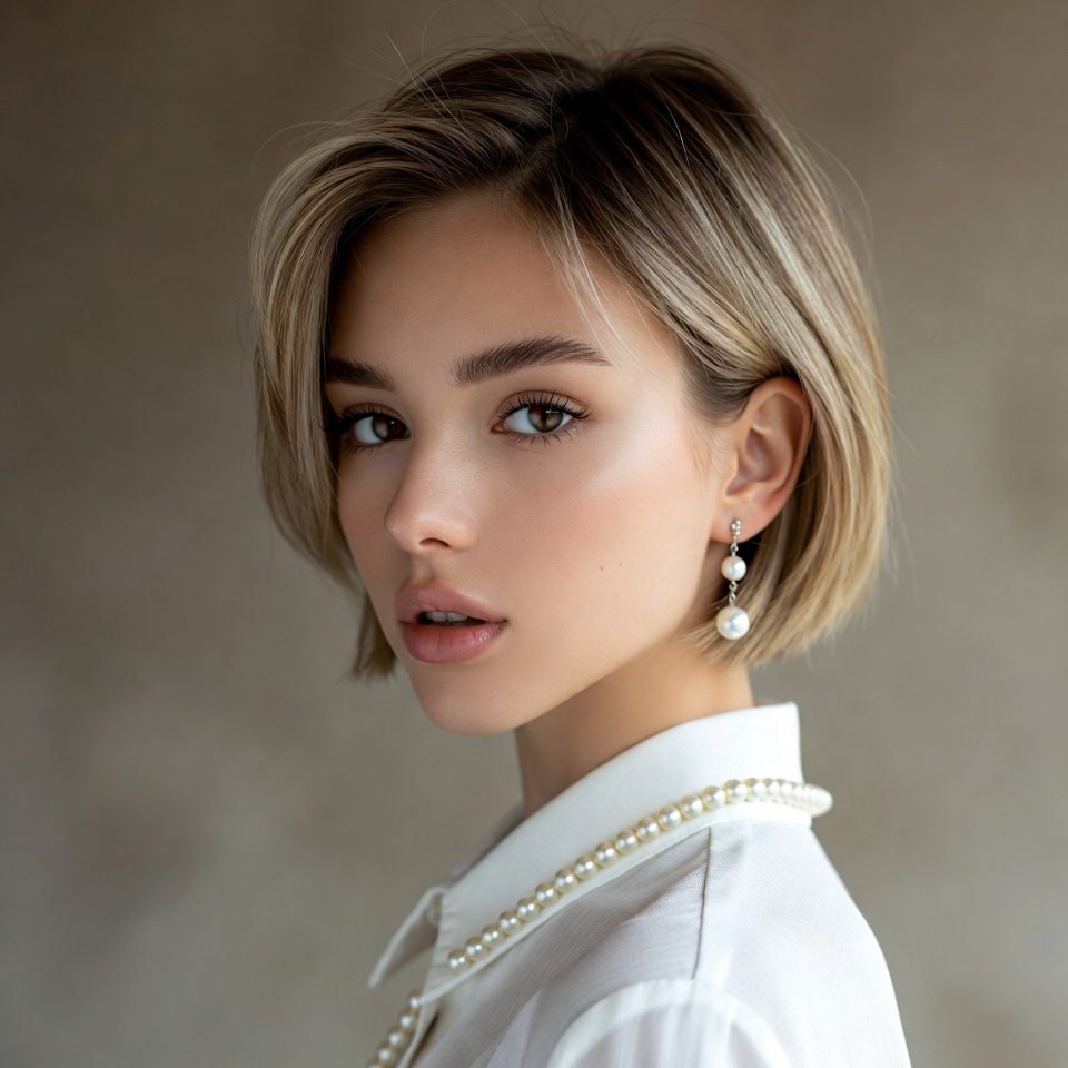 A young woman with blonde bob haircut turns her head slightly toward the camera against a neutral background. She wears a white collared shirt, a strand of pearl necklace, and dangling pearl earrings. Her makeup features defined eyes and glossy lips.