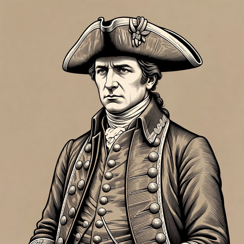 A man with a stern expression wears an 18th-century tricorn hat adorned with a feather and a detailed colonial coat with buttons and lace. He stands against a beige background in a line art illustration style. His hair is tied back in a ponytail.