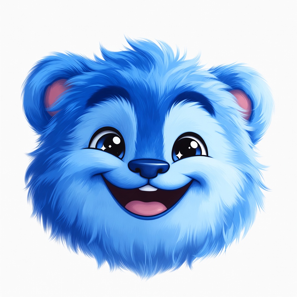 A fluffy blue cartoon bear with big sparkling eyes and a wide happy smile is illustrated on a white background. The bear has vibrant blue fur, pink inner ears, and a black nose. Its cheerful expression features rosy cheeks and detailed fuzzy texture.