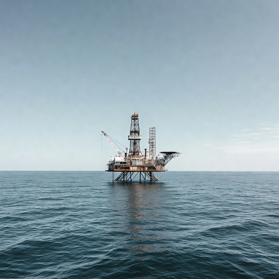 A large offshore oil platform stands in calm ocean waters under a partly cloudy sky. The rig features multiple towers, cranes, and decks with industrial structures. Its reflection is visible in the blue sea below.