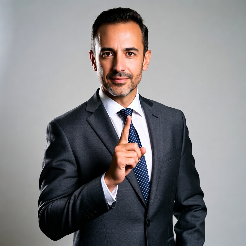 A man with short dark hair and a trimmed beard stands against a gray background, wearing a dark gray suit, white shirt, and blue striped tie. He points forward with his right index finger while keeping a neutral expression. His left hand rests at his side.