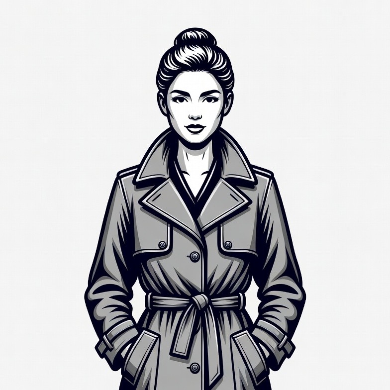 A stylized line art illustration depicts an Asian woman with hair in a bun, wearing a long belted trench coat. She stands frontally with hands in pockets against an isolated white background. The artwork features bold outlines and shading in black and gray tones.