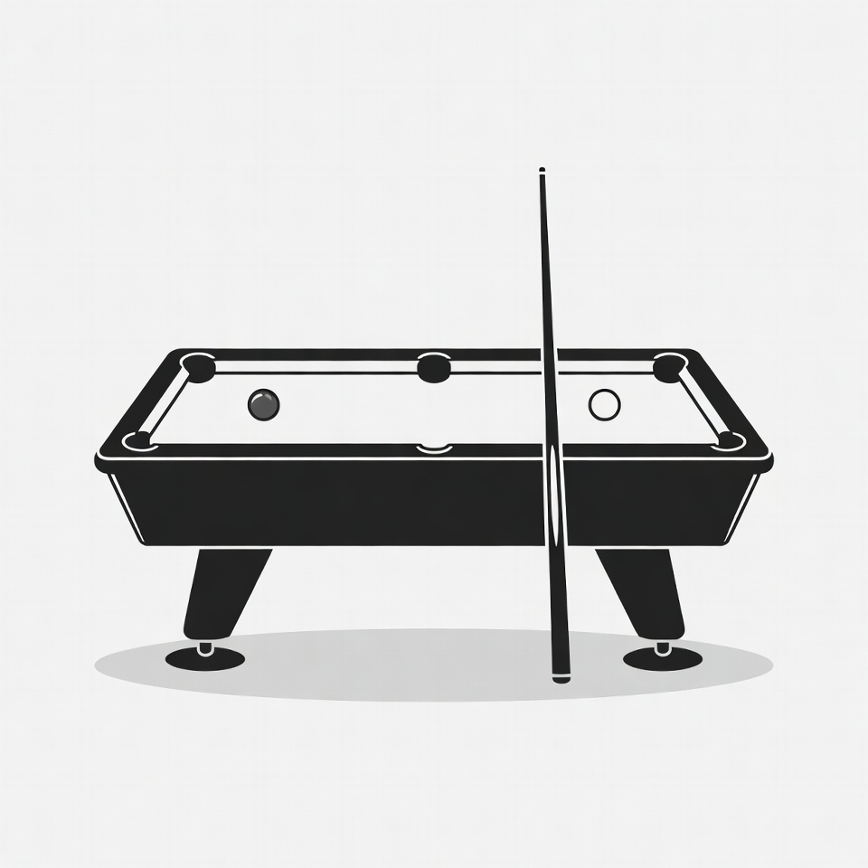 A black silhouette illustration of a pool table on a white background features six pockets and two billiard balls on the green felt surface. A tall cue stick stands vertically beside the table. The table has sturdy black legs and subtle shadows beneath it.