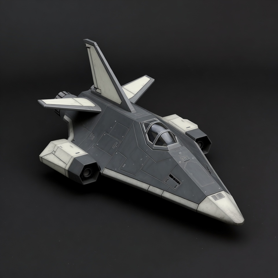 aircraft model, black background, cockpit canopy, engine nozzles, futuristic spaceship, gray spaceship, model spaceship, sci-fi aircraft, sci-fi model, space fighter, space vehicle, stealth fighter, triangular design, white accents, spaceship