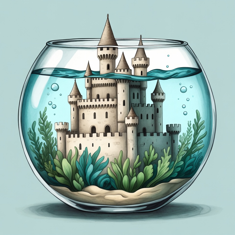 An illustration depicts a detailed stone castle with multiple towers submerged inside a transparent glass fishbowl filled with water. Green seaweed and bubbles surround the castle, creating an underwater scene on a sandy base. The artwork features a light blue background with soft shading.