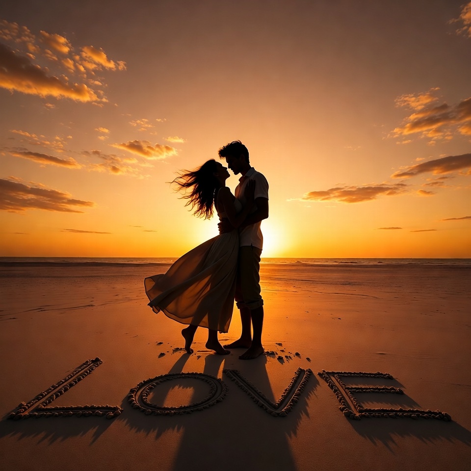 A silhouette of a man and woman kissing passionately on a sandy beach at sunset. The woman wears a flowing dress with wind-swept hair, while the man is in shorts and a shirt. The word 'LOVE' is written in large letters on the sand in front of them, with orange skies and ocean waves in the background.
