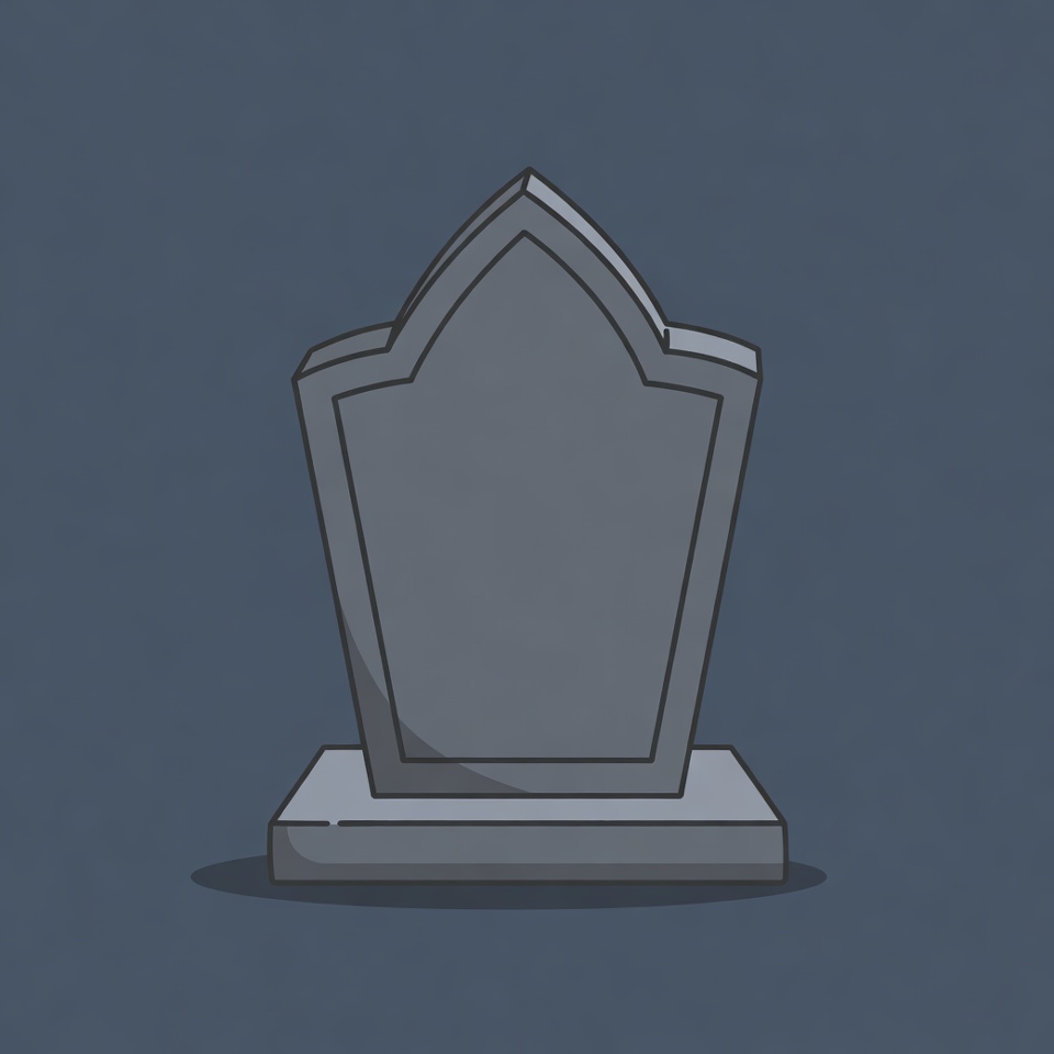 A simple flat illustration of a gray gravestone with an arched top stands centered on a dark blue background. The tombstone features clean line art with subtle shading and a small shadow beneath its base. No text or decorations appear on the blank front surface.