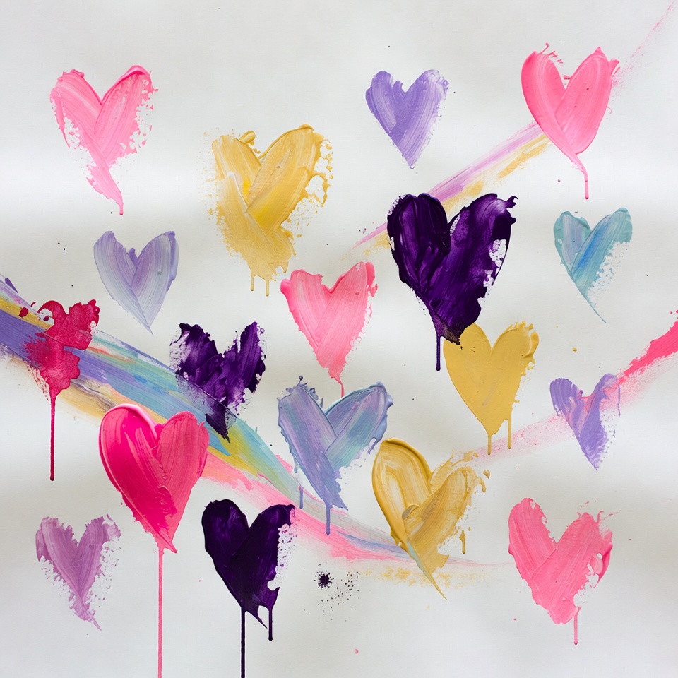 A collection of vibrant hearts in pink, purple, yellow, and gold splatters against a white background. Rainbow streaks and drips add dynamic movement to the abstract design. The hearts vary in size and overlap playfully.