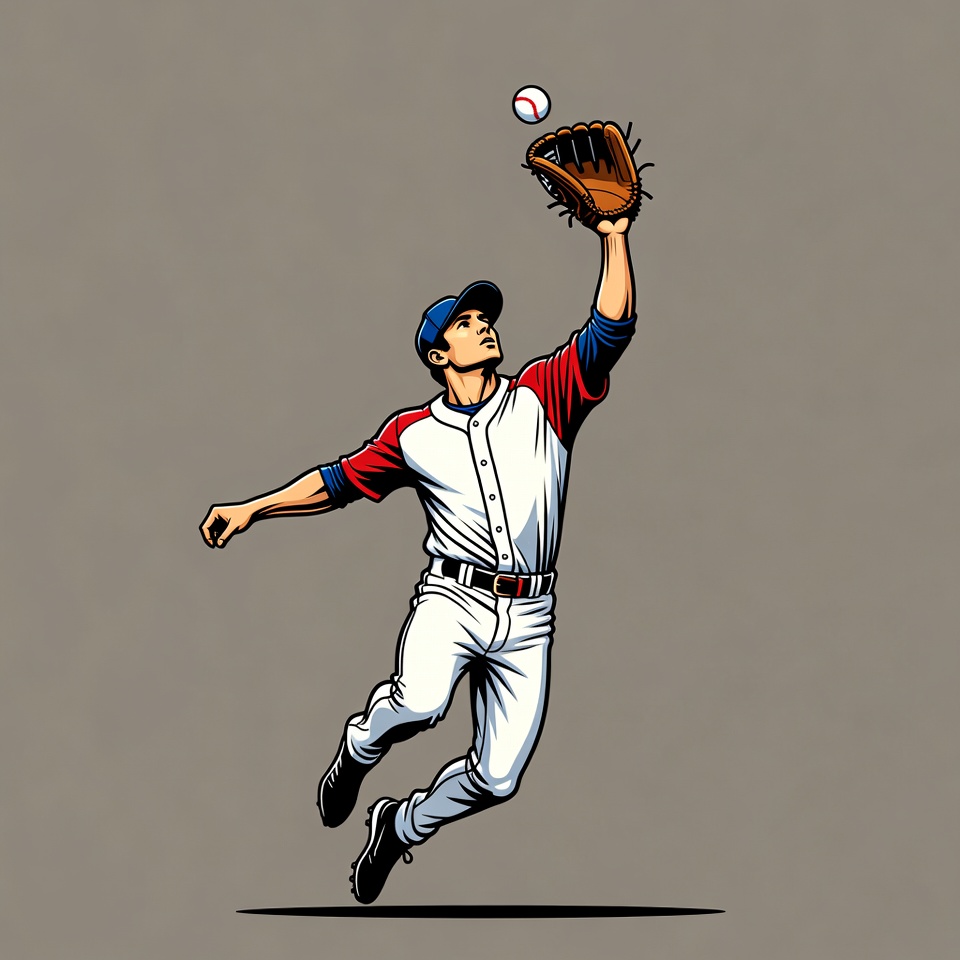 A cartoon illustration of a male baseball player leaping to catch a baseball with his glove. He wears a white uniform with red and blue sleeves, a blue cap, and black shoes. The figure is isolated against a plain gray background.