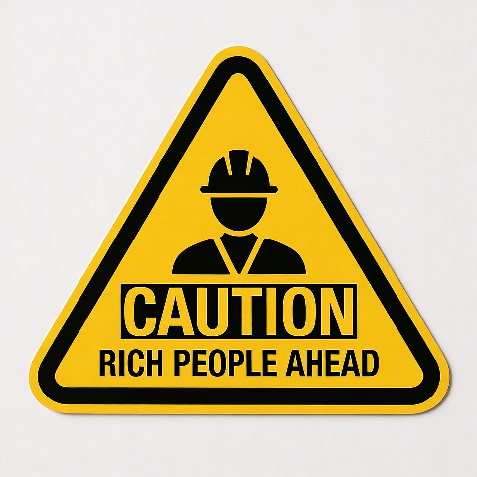 black outline, bold text, construction worker, funny warning, hard hat, humor sign, isolated background, rich people, road sign, safety sign, silhouette, warning sign, worker icon, yellow triangle, caution sign