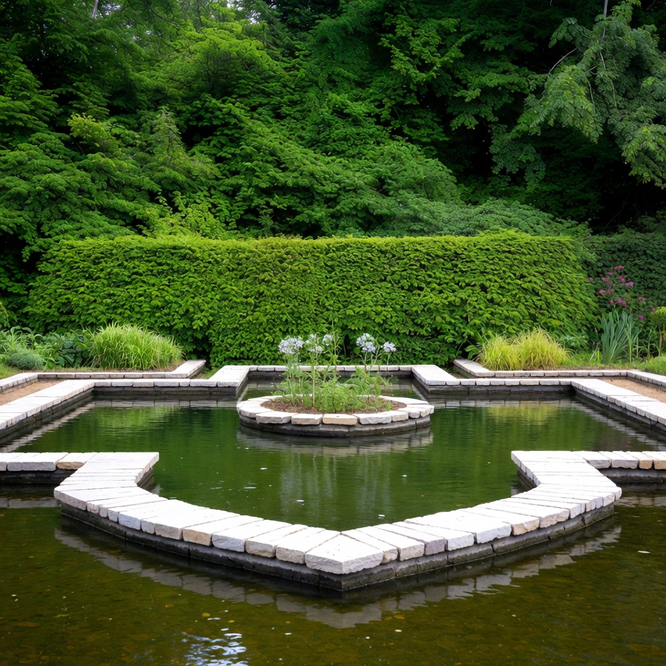 foliage, formal garden, garden, greenery, heart shaped, hedges, isolated background, landscaping, lush garden, nature, ornamental grass, outdoor, pink flowers, plants, pond, reflection, stone fountain, trees, water, white flowers, fountain