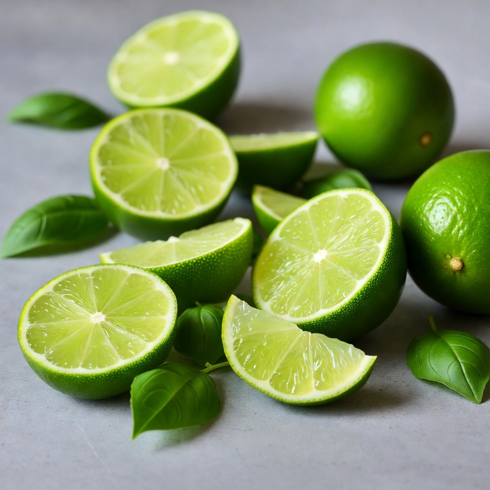 Several whole green limes and halved limes with exposed white interiors are arranged on a gray surface. Fresh green basil leaves are scattered among the limes. The composition is a close-up flat lay with a neutral background.