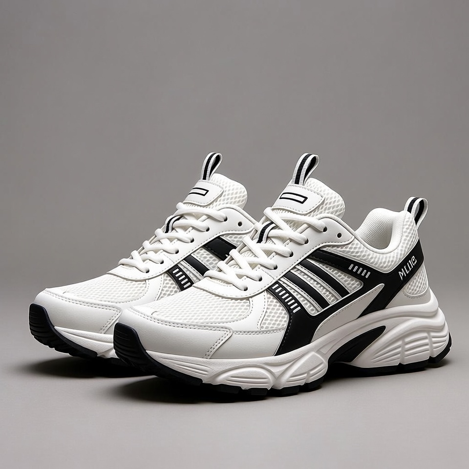 PL brand, athletic shoes, black accents, branded shoes, casual shoes, chunky sneakers, footwear, gray background, high-top sneakers, isolated background, mesh panels, platform sneakers, running shoes, sneakers pair, sportswear, stripes, thick laces, white sneakers, sneakers