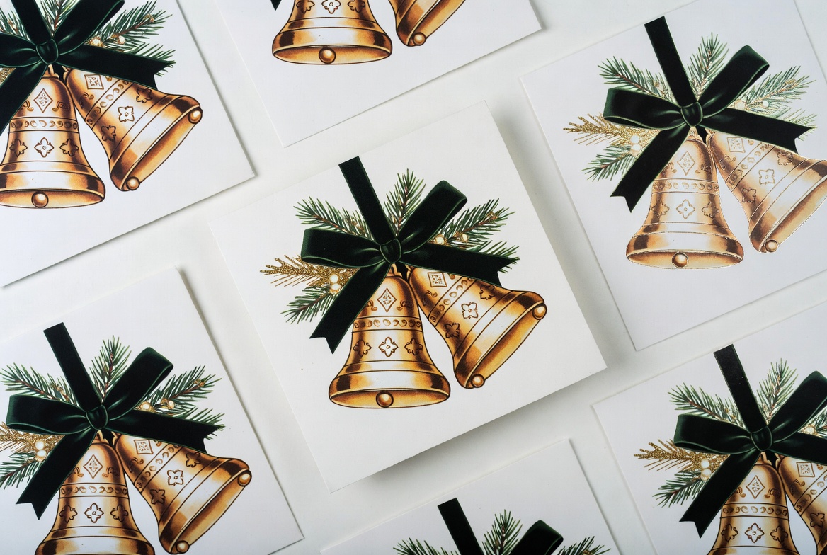 Christmas decoration, black ribbons, bow ties, clipart, evergreen sprigs, festive bells, golden bells, holiday decor, holly branches, illustration, isolated background, jingle bells, repeating pattern, vintage style, white background, Christmas bells