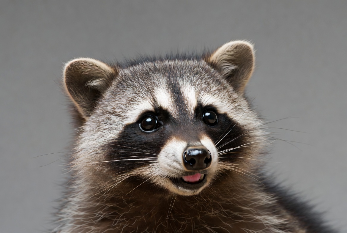 adorable, animal, big eyes, black mask, closeup, cute raccoon, fluffy fur, furry, gray background, isolated, mammal, masked face, nature, pink tongue, portrait, raccoon face, staring, wild animal, wildlife, raccoon