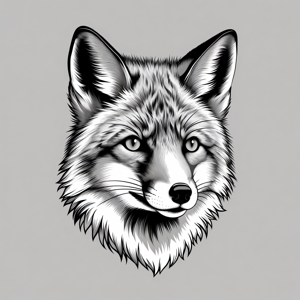 alert expression, animal, black and white, clipart, detailed fur, ears, eyes, fox head, furry, grayscale, illustration, isolated background, mammal, muzzle, portrait, vector art, whiskers, wildlife, fox