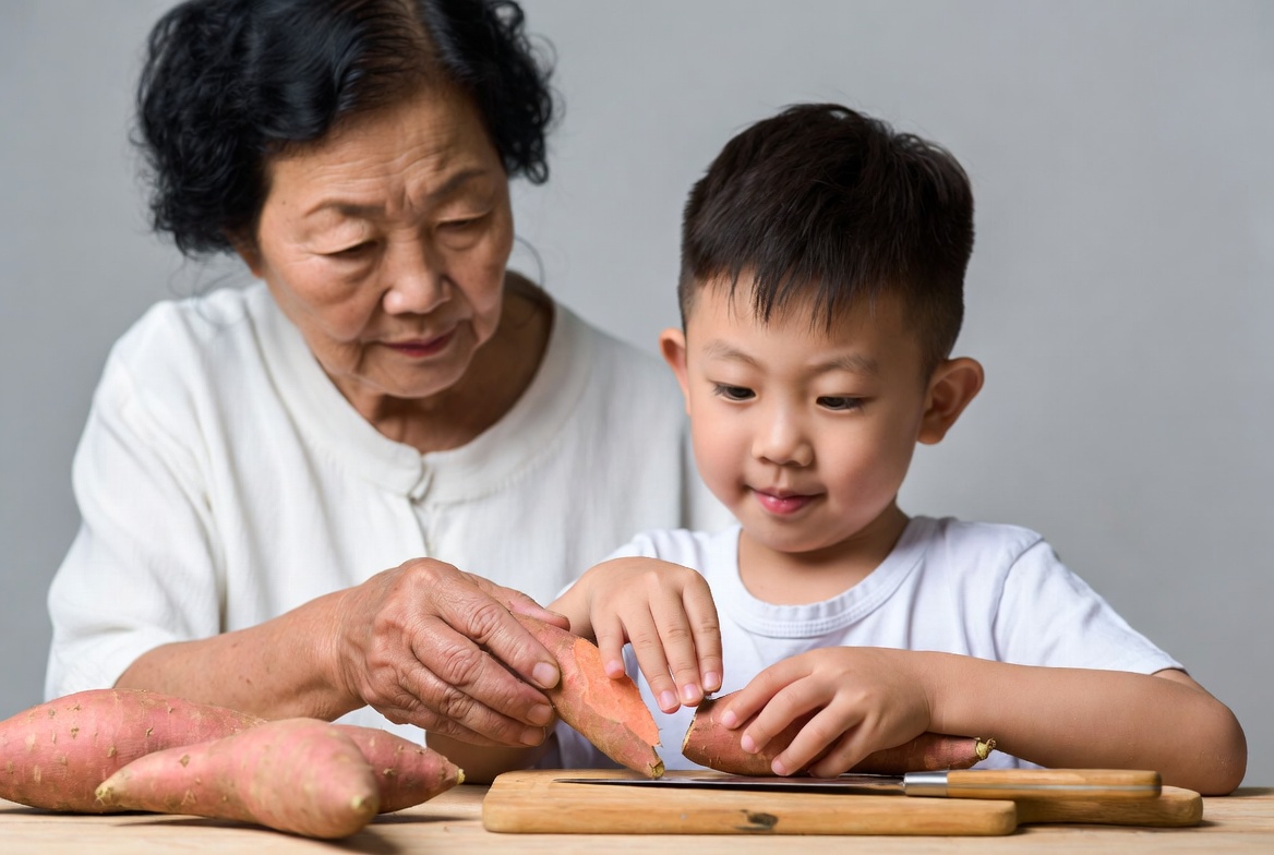 An elderly Asian grandmother and a young Asian boy sit at a wooden table, cutting orange sweet potatoes with knives. The grandmother wears a white top and holds a sweet potato steady while the boy grips his knife carefully. Several whole sweet potatoes are placed on the table in front of them against a plain gray background.