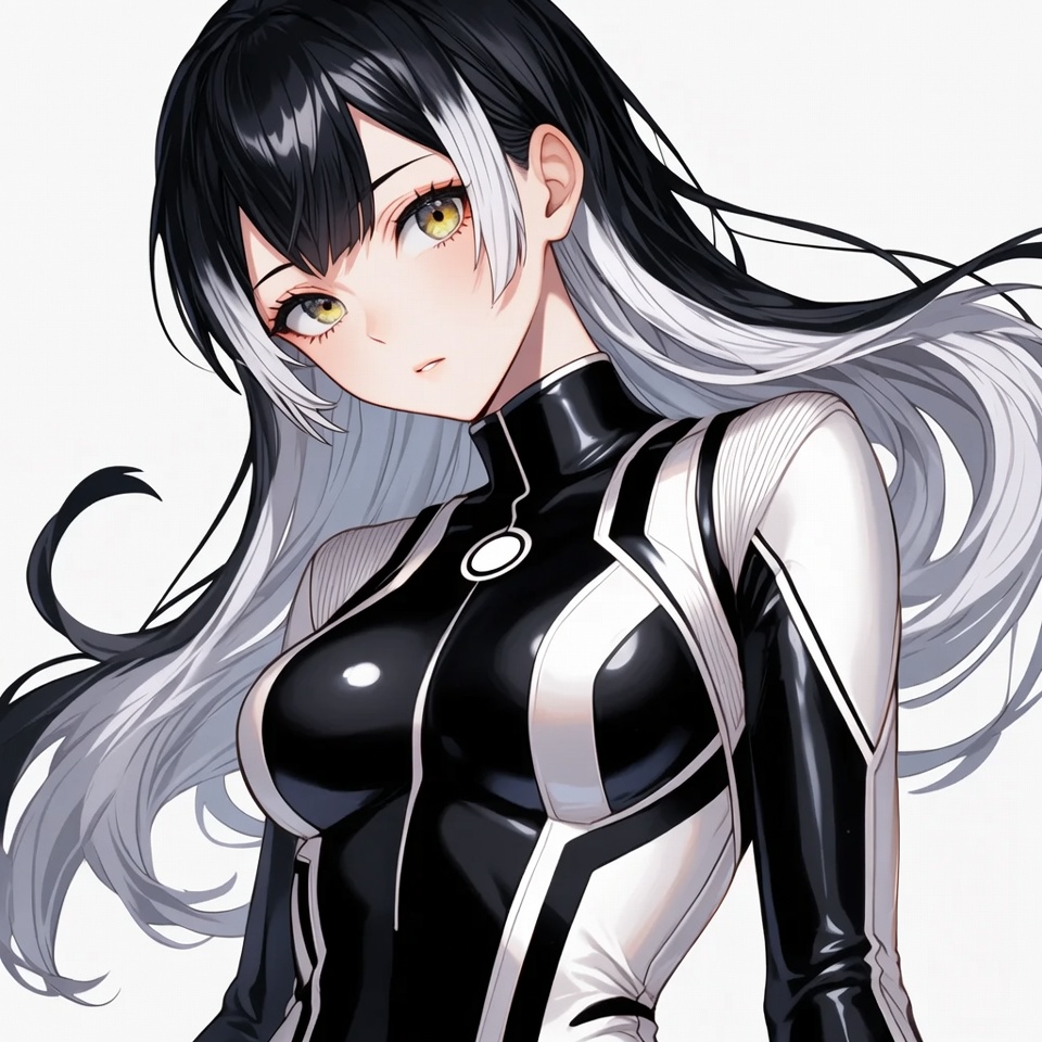 An anime illustration features a young woman with long black and white hair and yellow eyes. She wears a shiny black and white bodysuit with a circular emblem on the chest. Her expression is slightly pouting against an isolated white background.
