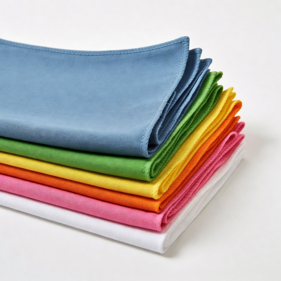 A stack of folded fabric napkins in various colors sits on a white background. The napkins include shades of blue, green, yellow, orange, pink, and white, neatly arranged from top to bottom. The edges are precisely folded, creating a vibrant and organized display.