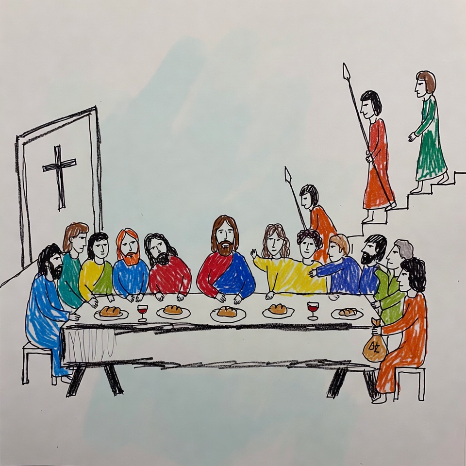 Christianity, Jesus, White, apostles, biblical art, bread, clipart style, colorful drawing, cross, dinner table, disciples, door, illustration, long table, male, religious illustration, seated people, spear, standing figure, steps, wine, wooden bench, Last Supper