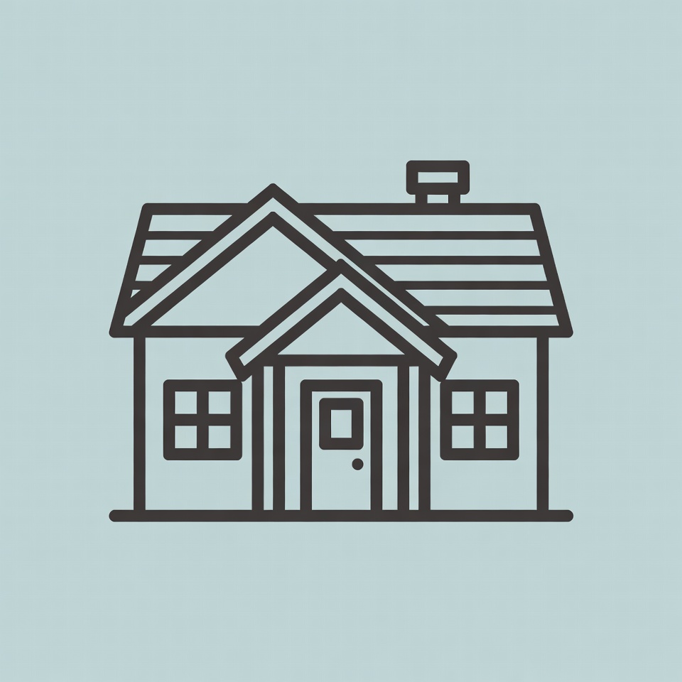 A simple black line illustration of a house on a light blue background. The house features a gabled roof with chimney, front door, two windows, and a small porch. It has a clean, minimalist vector style.