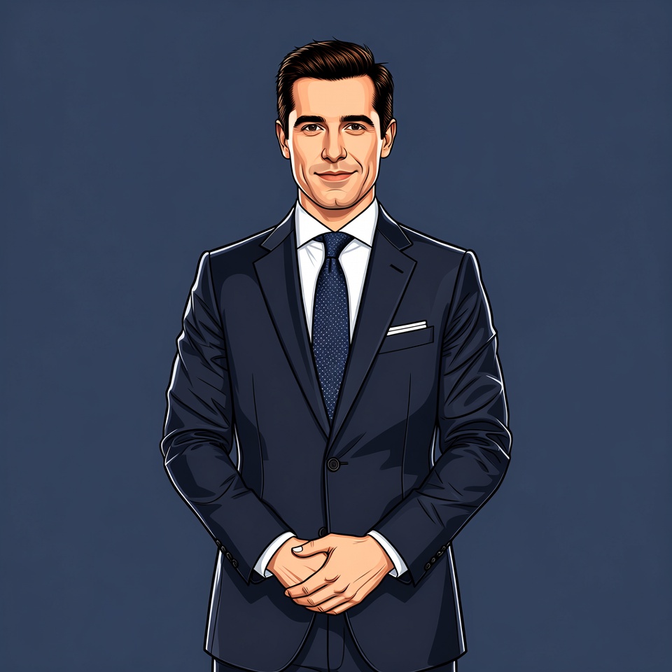 A cartoon illustration of a man with short dark hair stands smiling against a dark blue background. He wears a navy blue suit, white dress shirt, and navy tie with a pocket square. His hands are clasped in front of him.