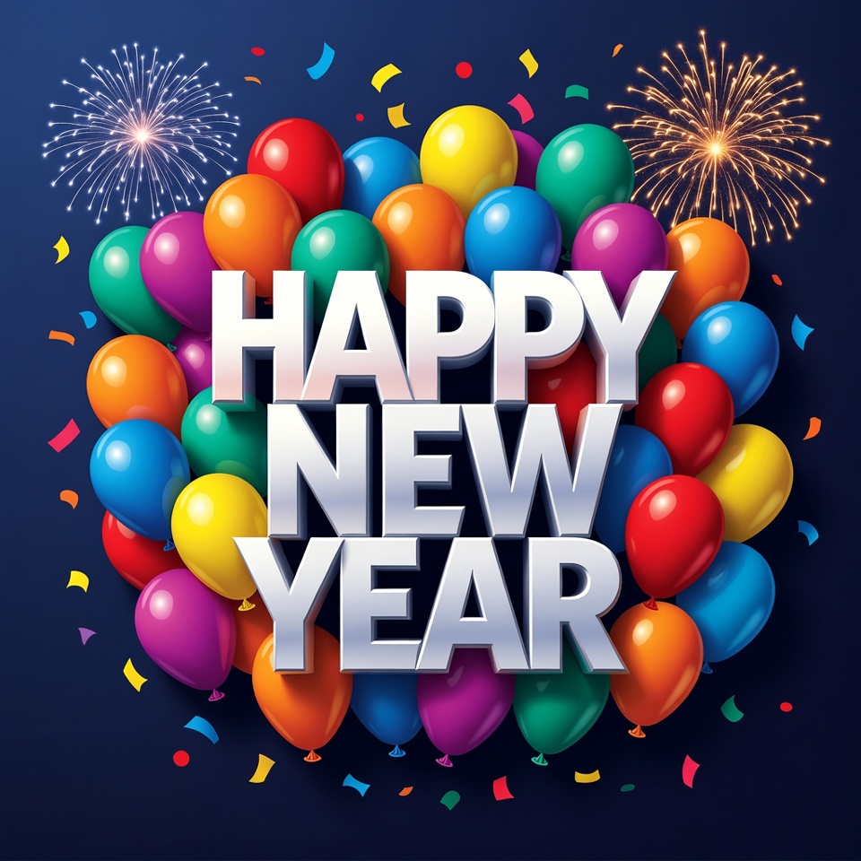 A vibrant illustration features the bold text 'Happy New Year' in silver letters surrounded by a cluster of colorful balloons in red, blue, purple, green, and yellow. Bright fireworks explode in the background against a dark blue backdrop, with scattered confetti adding festive flair.