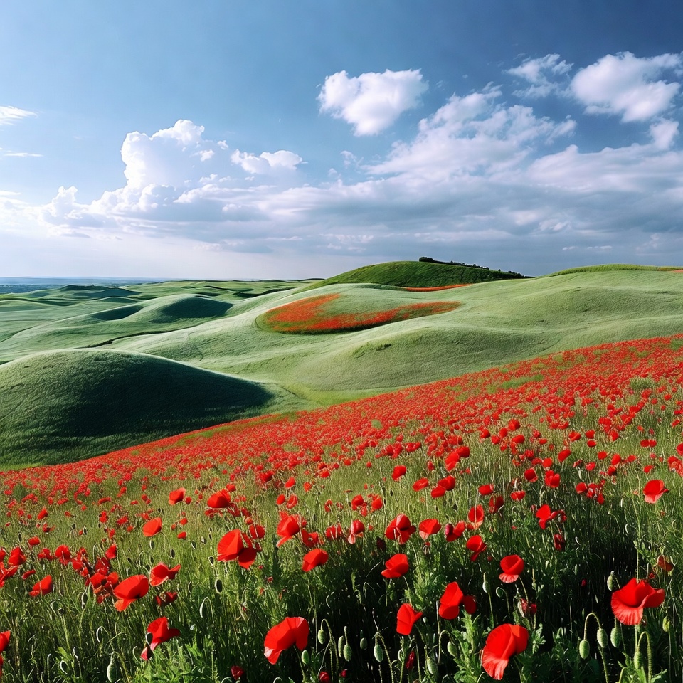Vibrant red poppy fields blanket rolling green hills under a bright blue sky with scattered white clouds. The landscape features undulating hills with patches of poppies forming heart-like patterns. Sunlight illuminates the vivid contrast between the flowers and grass.