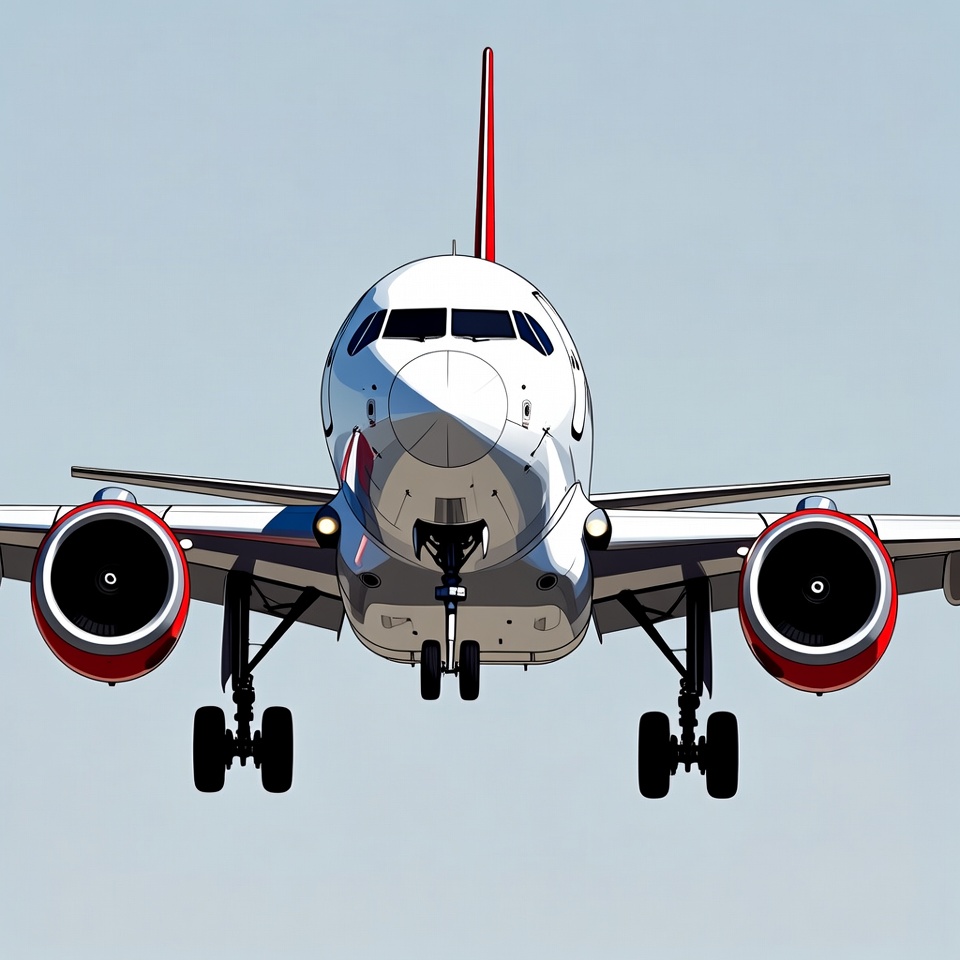 aircraft, aircraft nose, aviation, cockpit windows, commercial jet, flying machine, front view, illustration, isolated background, jet engines, landing gear, passenger plane, plane, red accents, sky background, tail fin, vector art, wheels, white airplane, airplane