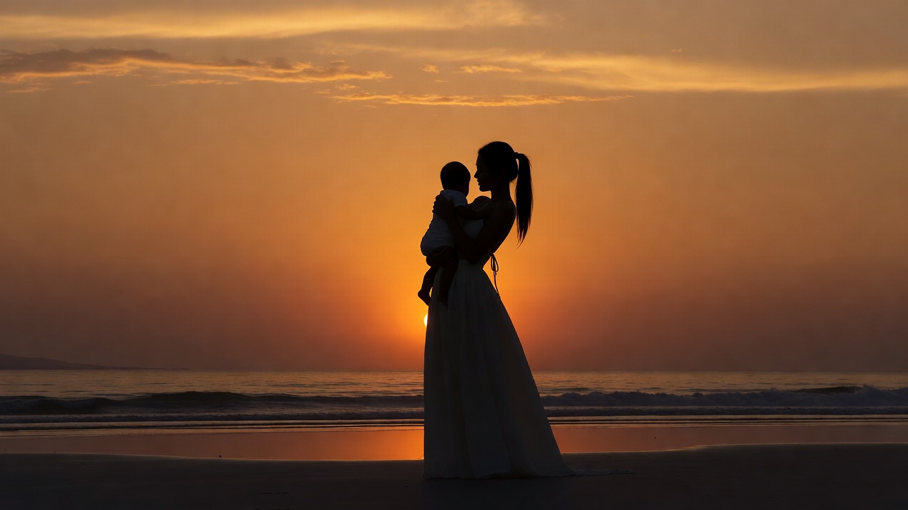 A silhouette of a woman in a long dress holds a baby on a beach at sunset. The warm orange sky and ocean waves frame their figures perfectly. Her ponytail is visible in the shadow outline.
