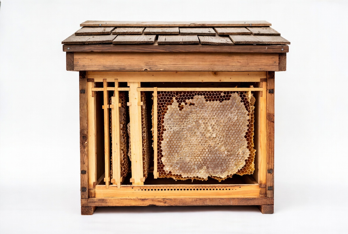 A wooden beehive box with a slanted shingle roof stands on a white background. Inside the open front, multiple wooden frames hold large hexagonal honeycombs filled with honey. The structure features a screened bottom and protective framing.